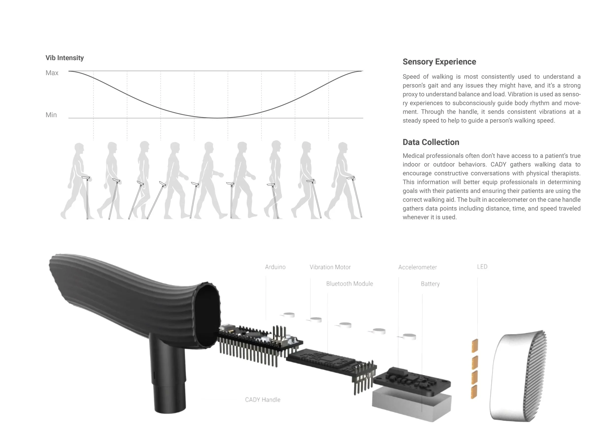 Up to 50% of individuals 65 years+ report a fear of falling and 65% of them report a resulting restriction in physical activity. This fear, however, is linked to higher fall incidence. People report that they slow their gait to feel in control but research shows that cautious gait results in overthinking and stride variation, reducing balance and increasing fall chance. Our study focuses on those physically abled, but due to their fear, require a cane. We ask, how might we reduce the fear of falling for cane users? We hypothesize that redesigning the cane to encourage confident gait and exercise could help reduce the fear of falling. This design has received a number of accolades from international design competitions: A' Design Award Winner, RSA Design Award Finalist, Core77 Design Award Finalist, and Tuvie's Top 20 List.